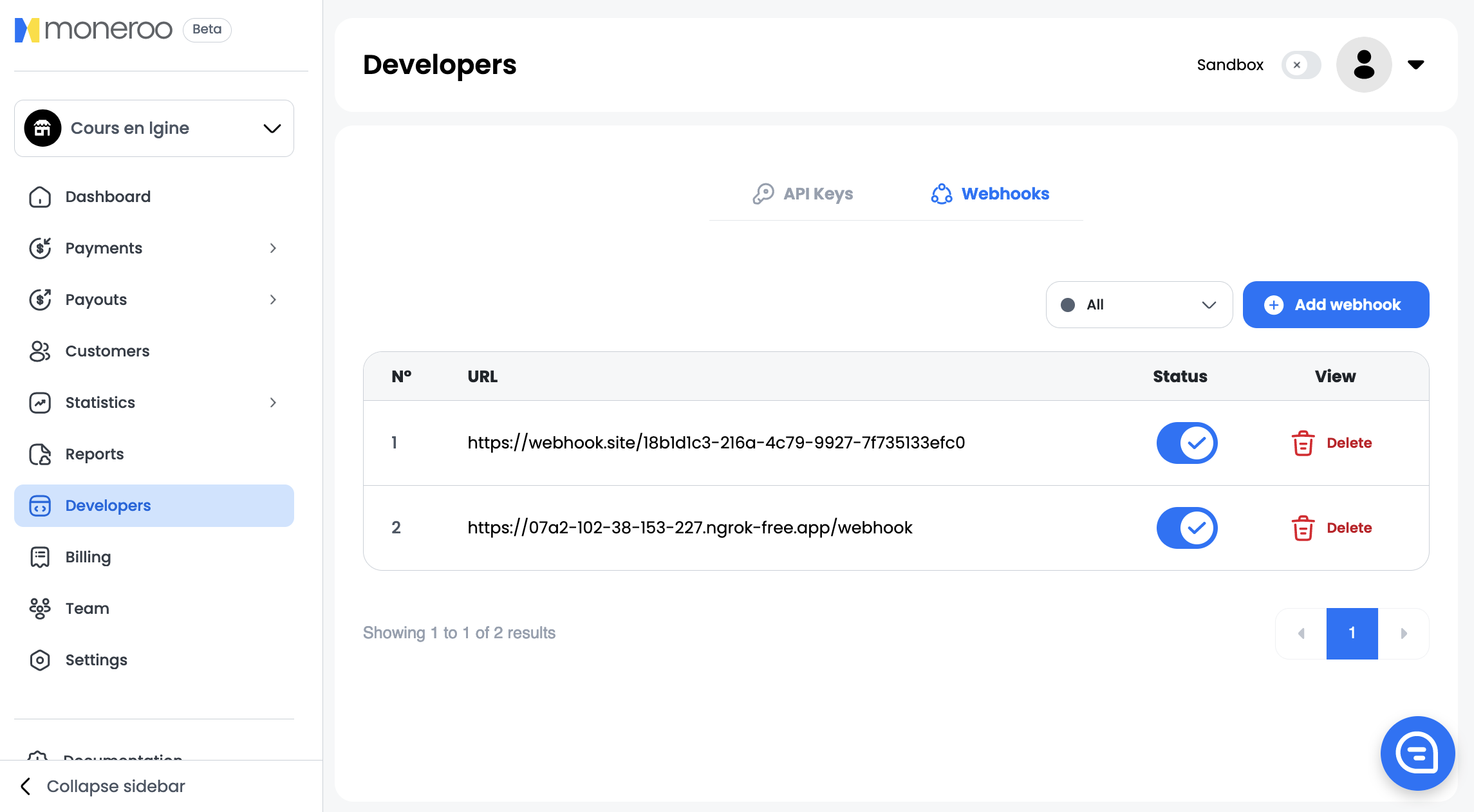 To configure webhooks, navigate to your app [dashboard](https://app.moneroo.io/), access the **Developers** section, and click on the **Webhooks** tab.&#x20;